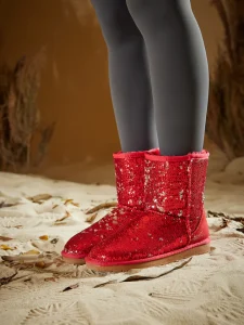 Dit model onderscheidt zich door de volledig met rode sequins bedekte buitenkant. De pailletten zorgen voor een opvallende, glamoureuze uitstraling die perfect past bij feestelijke gelegenheden, maar ook bij casual looks een speels accent toevoegt. De iconische UGG-vormgeving blijft behouden, waardoor de boots direct herkenbaar zijn.